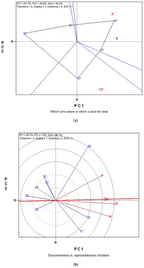 Biplot analysis of seed macronutrient P, K contents and seed crude protein (CP) concentration, in organic farming: (a) “which-won-where or which is best for what” view of the GGE biplot based on seed macronutrient P, K contents of five lentil genotypes in eight environments; (b) “discriminating power vs. representativeness” view of the GGE biplot based on seed macronutrient P, K contents of five lentil genotypes in eight environments.