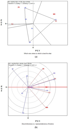 Biplot analysis of seed micronutrient content (Fe, Cu, Mn and Zn) in organic farming: (a) “which-won-where or which is best for what” view of the GGE biplot based on seed micronutrient contents (Fe, Cu, Mn and Zn) of five lentil genotypes in eight environments; (b) “Discriminating power vs. representativeness” view of the GGE biplot based on seed micronutrient contents (Fe, Cu, Mn and Zn) of five lentil genotypes in eight environments.