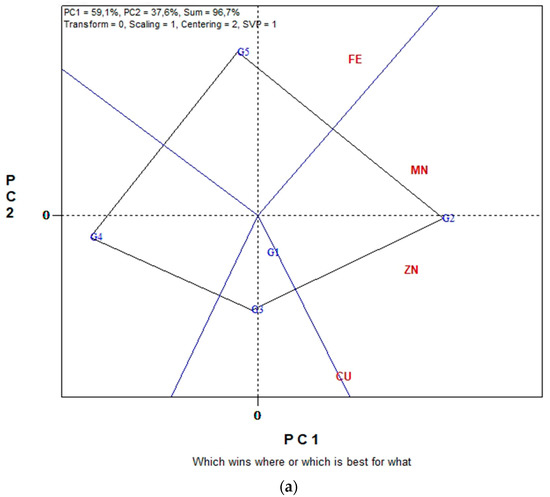 The GGE biplot analysis in Figure 5a,b illustrates data for seed micronutrient contents, i.e., Fe, Cu, Mn and Zn of five lentil genotypes across the eight environments in organic farming system. The first two principal components of GGE biplot analysis in Figure 5a explained 97.9% of total variation and in Figure 5b explained 78.2%.