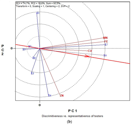 Biplot analysis of seed micronutrient content (Fe, Cu, Mn and Zn) in conventional farming: (a) “which-won-where or which is best for what” view of the GGE biplot based on seed micronutrient contents (Fe, Cu, Mn and Zn) of five lentil genotypes in eight environments; (b) “discriminating power vs. representativeness” view of the GGE biplot based on seed micronutrient contents (Fe, Cu, Mn and Zn) of five lentil genotypes in eight environments.