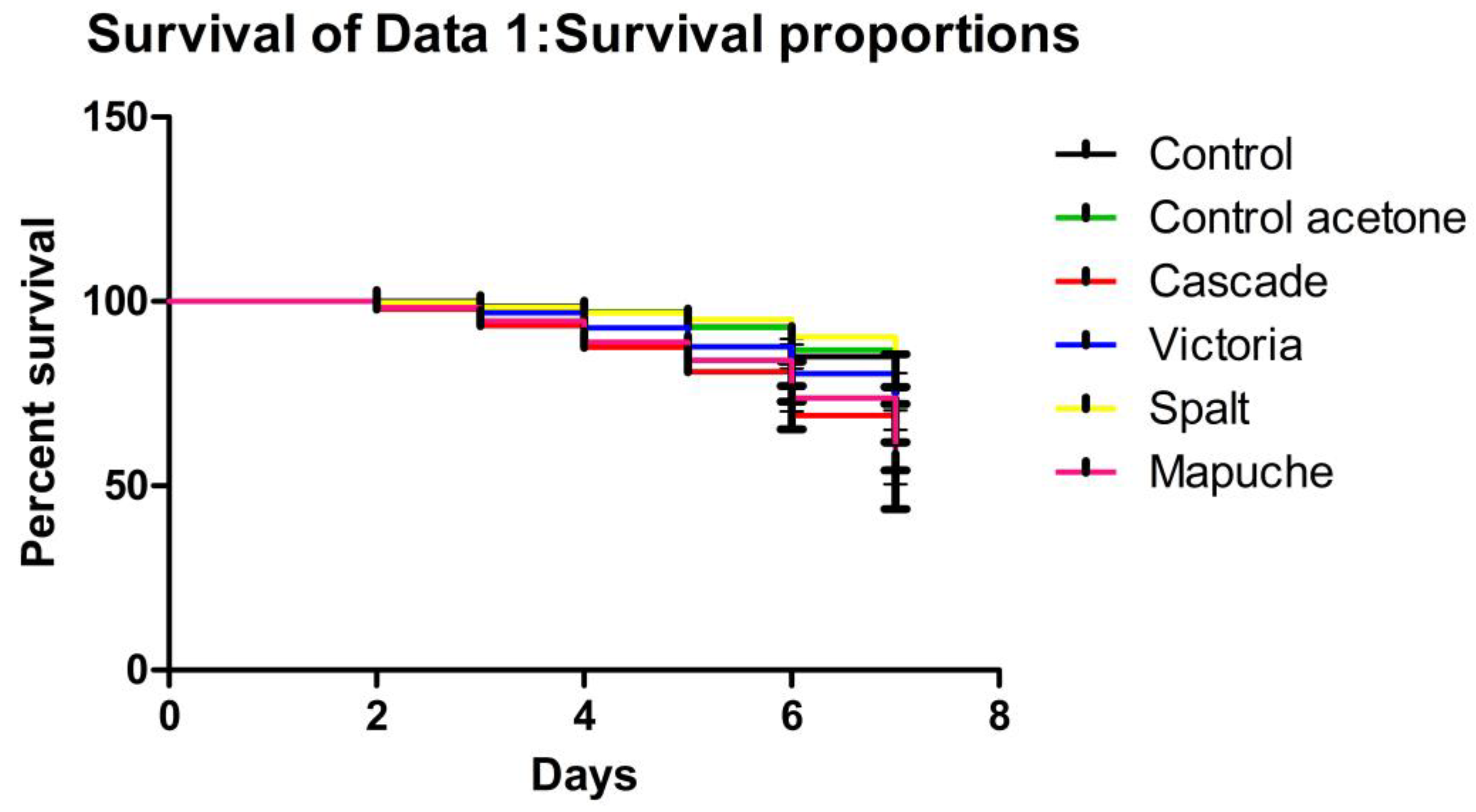 4.8.3. Analysis of Honeybee Larvae Lethality Tests and Weight