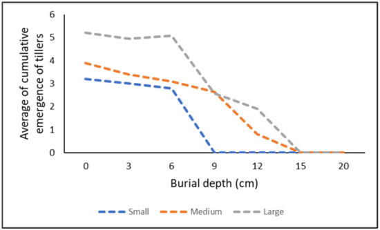 The results obtained from the mixed models for the cumulative emergence of tillers are summarised in Table 1. Soil did not have a significant effect on the emergence of tillers; however, burial depth, rhizome size, and their interaction all had significant effects (Table 1). In addition, time, interaction between burial depth and time, and interaction between rhizome size and time had significant effects on the emergence of tillers (Table 1).