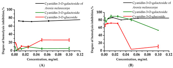 Thus, the studied compounds showed their best membrane-stabilizing activity against oxidative degradation of RBCs by the Fenton reagent at concentrations of up to 0.025 mg/mL, where hemolysis inhibition levels of up to 72%, 90% and 86% were observed for Cy-3-Glu, Cy-3-Gal and Aronia Cy-3-Gal, respectively. The cyanidin-3-O-galactoside extract of Aronia melanocarpa exhibited the highest protection against osmotic damage to blood cells.