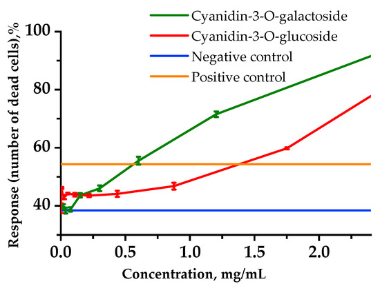 The cytoprotective activity of anthocyanins was studied in vitro using a human lymphoblast RPMI-1788 cell line (Figure 3). Cyclophosphamide (CP) as a cytostatic drug inhibited cell vitality. For example, in a positive control medium with CP at 1.25 mg/mL, the number of dead cells increased to 54.3%.
