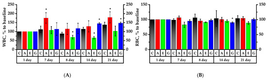In the group of rats fed with Cy-3-Gal Aronia for 7 days, the RBC count was observed to increase by 6.3%, while this value decreased by 17.3% in Group E and by 5.1% in Group G (Figure 4B). Seven days after cytostatic injection, a 13.6% RBC decrease was observed in Group G as compared to the values of the 1st day (p < 0.05). On the 21st day of the experiment, the value significantly increased by 10.8% as compared to the 14th day (p < 0.05). The changes in RBCs following the Cy-3-Gal Aronia effect were not so significant; namely, 24 h after the CP injection, a decreasing trend in value was observed, but in 7 days it recovered and even tended to increase by the 21st day of the experiment.