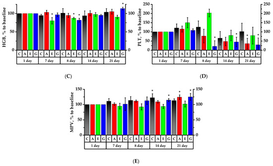 Main hematology results for whole blood of lab animals. The corresponding baselines for each group on the 1st day of the experiment are taken as 100%. (A) White blood cell (WBC) count; (B) red blood cell (RBC) count; (C) hemoglobin (HGB) concentration; (D) platelet (PLT) count; (E) mean platelet volume (MPV). * p < 0.05, significance of differences in animal groups compared to the 1st day of the experiment.