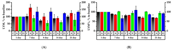 Lymphocyte analysis (LYM) also revealed an increase in the number of cells in the group of rats receiving Aronia anthocyanins proactively. Similar to leukocytes, there was a downward trend in the number of lymphocytes in the Control Group, in Group E and in Group A after 8 and 14 days of the experiment (Figure 5A). On the 21st day, LYM count increased by 25.3% over 1 day in Group A, by 33.7% in Group G, and by 22.1% in Group E over 8 days of the experiment (p < 0.05). On the 14th and 21st days of the experiment, LYM count in Group G was reliably higher than that in Group A by 3.5% and 8.3%, respectively (p < 0.05), meaning that cyanidin glycosides stimulated the functional metabolic activity of rat lymphocytes.