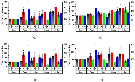 Leukocyte profile. The corresponding initial values for each group in the 1st day of the experiment are accepted as 100%. (A) Lymphocyte (LYM) count; (B) ratio of lymphocytes to total leukocytes (LYM%); (C) monocyte (MON) count; (D) ratio of monocytes to total leukocytes (MON%); (E) neutrophil granulocyte (GRA) count; (F) ratio of granulocytes to total leukocytes (GRA%). * p < 0.05, significance of differences in animal groups compared to the 1st day of the experiment.