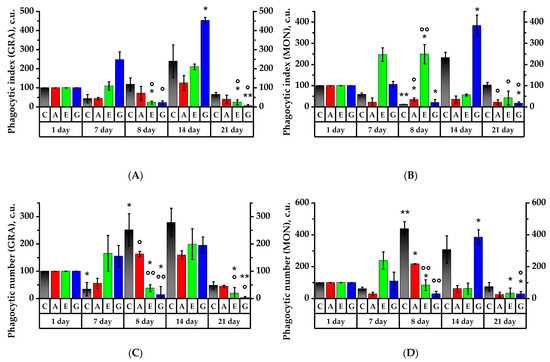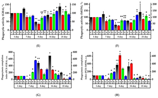 The study of the phagocytosis completion index (PCI) in the Control Group showed a 13 times decrease for granulocytes and 26 times decrease for monocytes (p < 0.05) by the 7th day of the experiment as compared to the 1st day, while in Groups E and G, the PCI increased by 2.1 and 5.6 times, respectively (Figure 6G,H). It is significant that by the 7th day, the PCI values for all experimental groups were significantly higher than the control values (p < 0.05)—by 3, 50 and 71 times for Groups A, E and G, respectively. On the 8th day of the experiment in the Control Group, the PCI of granulocytes and monocytes increased by 4.8 and 3.7 times, respectively (p < 0.01), as compared to the 1st day. On the 14th day, the ingestion of bacteria by granulocytes was reduced to a minimum, and PCI in the Control Group increased by 1.4 times (p < 0.05). By the 21st day, in the Control Group, PCI for granulocytes was higher than that of the experimental groups (p < 0.05) (Figure 6G).