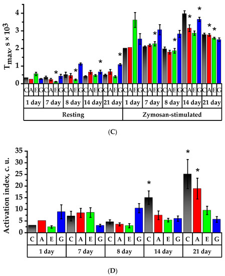 On the 14th day of the experiment, an increase in the intrinsic intensity of neutrophils’ CL was observed, in the Control Group by 10.3 times, in Group A by 4.7 times and in Group G by 3.5 times. The intensity of the zymosan-induced luminescence in the same groups increased by 12.3, 6.2 and 3 times, respectively. No significant changes in these parameters were observed in Group E (Figure 7A).