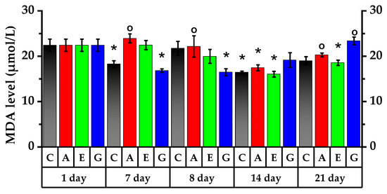 The extent of LPO was determined by the MDA content in erythrocytes of rat blood. MDA in blood was determined by carrying out the reaction between the reactive agent and thiobarbituric acid as described by Buege and Aust [66], but with a slight modification of the method. Red blood cells in the amount of 0.1 g washed with normal saline were homogenized into 0.15 mol L−1 KCl at a ratio of 1:9 with the help of a glass homogenizer. One volume of red blood cells was thoroughly mixed with two volumes of a matrix solution of 15% wt./vol. trichloroacetic acid, 0.375% wt./vol. thiobarbituric acid and 0.25 mol × L−1 hydrochloric acid. The solution was heated for 15 min over a boiling water bath. After cooling, the sediment was centrifugated at 1000× g for 10 min. The absorption of the transparent supernatant was determined at 535 nm, and the MDA concentration was calculated using 1.56 × 105 mol−1 cm−1 as the molar absorption coefficient. The MDA results were expressed in nanomoles per gram of blood with initial moisture.