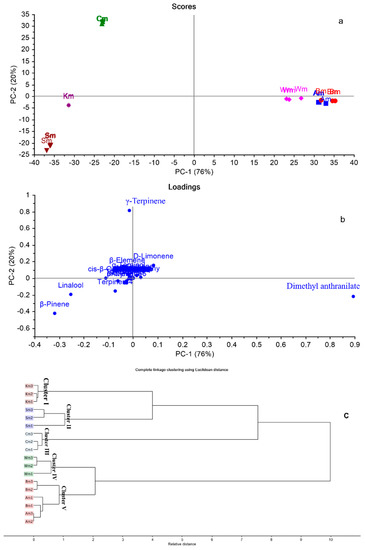PCA score plot (Figure 1a) explained about 96% of the variation in the dataset by the first two PCs, where PC1 accounting for 76% and PC2 for 20% of the variance. Different C. reticulata cultivars were assembled into four main groups on three different quadrants. Cultivars Cm, Sm, and Km were positioned on negative PC1, where Cm was positioned on the upper left quadrant. However, Sm and Km were placed on the lower one, well-discriminated from each other. Through clear investigation of the PCA score plot, it was observed that cultivars Am, Bm, and Wm were located on positive PC1, closely related to each other, where Am and Bm were superimposed on each other. The loading plot (Figure 1b) displayed the main discriminating markers responsible for PCA score plot pattern. Γ-Terpinene, linalool, and β-pinene were the key markers accountable for the segregation of Cm, Km, and Sm, respectively. However, dimethyl anthranilate was the compound responsible for the closeness of Am, Bm, and Wm cultivars.
