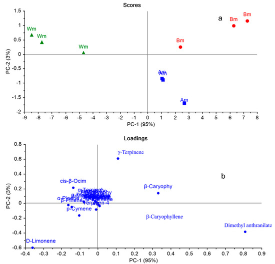 In an attempt to explore the ability of multivariate analysis to discriminate between closely related cultivars (Am, Bm, and Wm), PCA was applied on the GC-MS metabolic profiles of these three cultivars solely. Figure 2a,b displayed PCA score plot and loading plot, respectively. PCA score plot (Figure 2a) explained about 98% of the variation in the dataset by the first two PCs, where PC1 accounting for 95% and PC2 for 3% of the variance. Am, Bm, and Wm were completely segregated from each other in three different quadrants, where Am and Bm were positioned on PC1 on the right side of the plot confirming that they are closely related to each other in comparison with Wm that was located on negative PC1. Upon examination of the loading plot (Figure 2b), it was observed that dimethyl anthranilate was the major marker responsible for discriminating Am from other cultivars (Bm and Wm). However, γ-terpinene and β-caryophyllene were the main distinctive markers accountable for Bm cultivar segregation. Nevertheless, no distinctive marker was recognized in the loading plot for the separation of Wm. From this study, it was concluded that complete metabolic profile is mandatory for discrimination between closely related cultivars. For example, dimethyl anthranilate was the major component in the three cultivars (Am, Bm, and Wm); however, by applying multivariate analysis, it was observed that this marker could only discriminate Am from other cultivars. Similarly, regarding γ-terpinene is present approximately in the same percentage in the three cultivars; however, it discriminated Bm cultivar from other cultivars.
