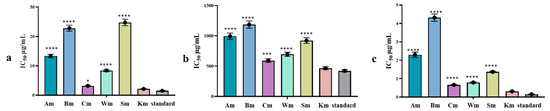 The antiaging capability of C. reticulata leaf cultivars essential oil was assessed via measuring their hyaluronidase, collagenase, and elastase enzyme inhibitory activity (Figure 3). Hyaluronic acid is one of the major building blocks of soft connective tissues that have a crucial role in maintaining the elasticity and moisture content of the skin, thus reducing wrinkles [44]. Hyaluronidase enzyme converts hyaluronic acid to small oligosaccharide moieties, consequently inhibitors of hyaluronidase are useful in hydrating the skin and delaying the aging process [45,46]. Among the tested cultivars Km and Cm were the most active with an IC50 value of 2.19 ± 0.10 and 3.22 ± 0.14 µg/mL, respectively, followed by Wm (IC50 = 8.43 ± 0.38 µg/mL) compared with the standard 6-O-palmitoyl-l-ascorbic acid exhibiting an IC50 of 1.56 ± 0.07 µg/mL. It is worth noting that Km cultivar showed no significant difference from the standard.