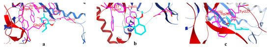 Binding modes of thymol (a), dimethyl anthranilate (b), and linalool (c) with hyaluronidase.