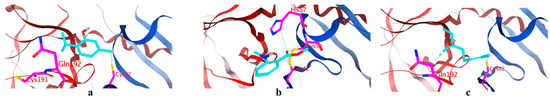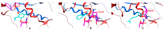 Binding modes of thymol (a), dimethyl anthranilate (b), and linalool (c) with elastase.