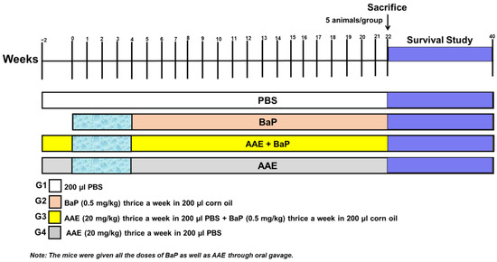 Experimental design of the in vivo studies. G1 (PBS) three times a week from −2 to week 21. G2 (BaP, 50 mg/kg b.w in 200 µL corn oil) thrice a week from week 0 to week 4. G3 (AAE 20 mg/kg in PBS) as G1 + BaP as G2, and G4 (AAE 20 mg/kg) as G1. All the animals were administered PBS and BaP, as well as AAE, orally.