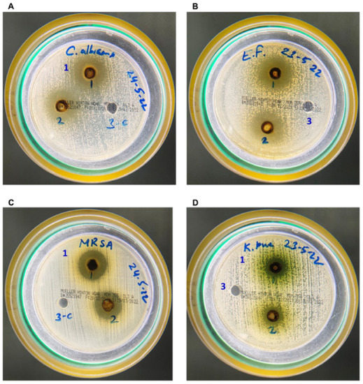 AAE shows antimicrobial activity against (A) C. albicans, (B) E. faecalis, (C) MRSA, and (D) K. pneumoniae.
