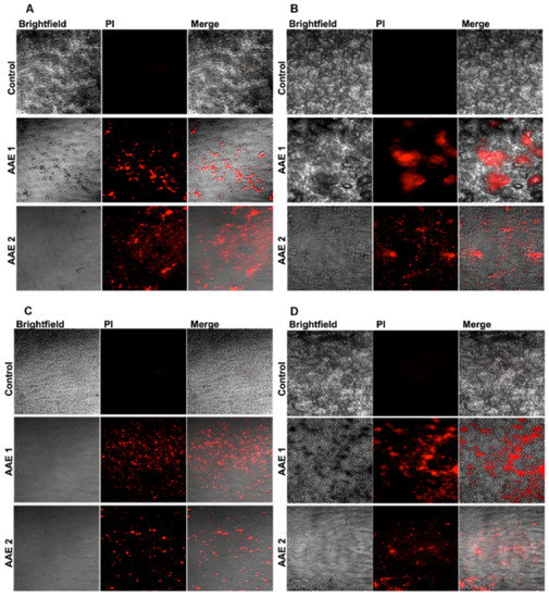The above-mentioned bacteria (E. faecalis, MRSA, and K. pneumonia) and C. albicans (1 × 105 CFUs) were cultured in TSB in the presence or absence of low-concentration (3 mg/mL) and high-concentration (6 mg/mL) AAE in 12-well sterile culture plates. After 24 h, the plates were gently washed with PBS. Bacterial and fungal cells were stained with propidium iodide (PI), then washed with PBS. The analysis of the cells was conducted under the confocal microscope using a 20X magnification objective as described earlier [46].