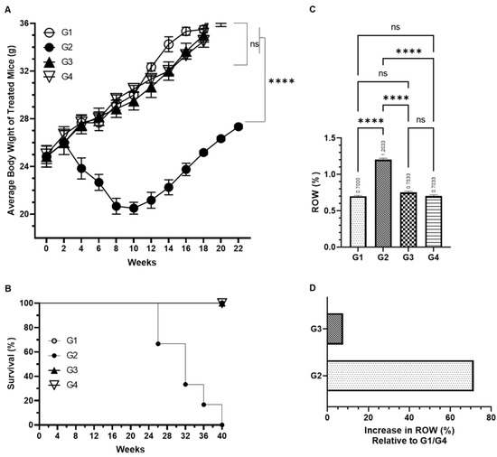 Effect of AAE on carcinogen-moderated (A) ABW, (B) survival, (C) RLW, and (D) increased percentage of RL relative to G1/G4. The values are given as the SEM of 5 animals in each group for (A,C), whereas it is ten mice for (B). ns No significance within the groups, **** Significant difference between the groups, p-value < 0.0001.