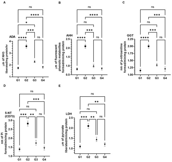 Effects of AAE on BaP-induced cancer marker enzymes in the serums (A) ADA, (B) AHH, (C) GGT, (D) 5-NT (CD73), and (E) LDH. The values are given as the SEM of three different experiments. ns No significance within the treated groups; * significant difference between the groups, p-value < 0.05; ** significant difference between the groups, p-value < 0.01; *** significant difference between the groups, p-value < 0.001; **** significant difference between the groups, p-value < 0.0001.