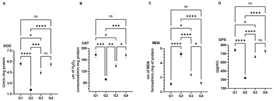 Effect of AAE on antioxidant enzymes in lung tissues: (A) SOD, (B) CAT, (C) MAD, and (D) GPx1. The values are given as the SEM of three different experiments. ns No significance within the groups; * significant difference between the groups, p-value < 0.05; ** significant difference within the groups, p-value < 0.01; *** significant within the groups, p-value < 0.001; **** significant difference within the groups, p-value < 0.0001.