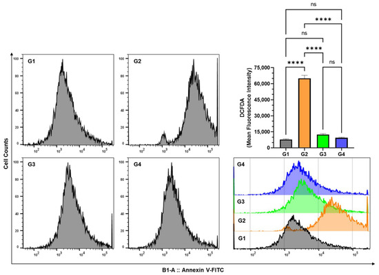 The DCFDA staining of the lung cells was analyzed with the mean fluorescence intensity (MFI) using FlowJo following the acquisition of the sample in the MACSQuant analyzer. The results showed a significant induction of cellular ROS in BaP-exposed G2 mice, as its MFI reached 65100 ± 2888.5 SEM, while it was measured as 7833.3 ± 643.8 SEM and 9466.7 ± 606.5 SEM in G1 and G4, respectively (Figure 7). However, AAE showed chemopreventive potential and significantly reduced the cellular ROS, as it recorded a 12,500 MFI ± 866.025 SEM in G3 mice (Figure 7).