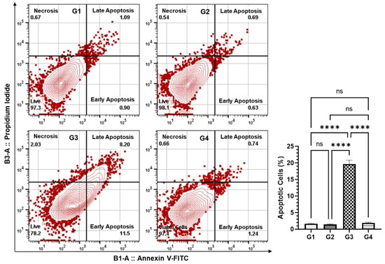 The annexin V-FITC and PI staining of the lung cells was analyzed using FlowJo following the acquisition of the sample in the MACSQuant analyzer. The analysis showed that 36% of the cells were induced to apoptosis in G3 mice pretreated with AAE, while no induction of programmed cell death was measured in any other group (Figure 8).