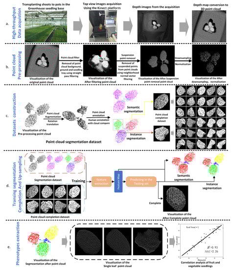 Flowchart of the procedure in this paper. (a) High-throughput seeding data acquisition using Kinect. (b) Point cloud preprocessing includes point cloud filtering, point cloud down-sampling, and normalization. (c) Annotation of data, data enhancement, and missing point cloud datasets construction using Cloud compare software. (d) Semantic segmentation of seedlings and missing leaf completion by MIX-Net. (e) Phenotype extraction using organ semantic segmentation and missing completion results.