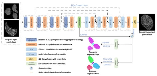 We consider that it is because most of the feature extraction of the above methods only divide the point cloud into local point cloud blocks to enrich the extraction of local features of the point cloud. However, for the interaction between point cloud blocks, the above methods all only perform simple interaction between adjacent blocks. Subsequently, some people also use attention mechanisms to enhance this interaction, but this approach will occupy a lot of space, and there is no simple and effective attention mechanism for 3D point clouds that can well solve the segmentation of such overlapping point clouds. Therefore, we develop a point cloud segmentation method based on the U-net shape hybrid point-mixer mechanism, referred to as MIX-Net, which consists of a continuous encoder–decoder network. In the encoder, considering previous point cloud feature extraction methods, such as PointNet++ [] and DGCNN [], the point cloud is first transformed into point cloud blocks using the K-nearest neighbor algorithm, and the features of each point cloud block are extracted by a convolutional neural network (CNN) or a custom convolutional module. However, converting the whole point cloud into point cloud blocks is too costly, there is also a large amount of redundancy, and the interaction between point cloud blocks is missing. We propose a simpler interactive feature fusion module that samples key points in the complete point cloud using point cloud curvature sampling, and then uses the key points for K-nearest neighbors to form point cloud blocks, which reduces the computational cost and redundancy between point cloud blocks. In addition, to increase the feature interaction between point cloud blocks, we borrow the success achieved by purely linear mlp-mixer in 2D images []. We design a purely linear point-mixer feature interaction network. It mainly includes the feature interaction within the interactive feature fusion point cloud blocks and the feature interaction between each point cloud block. Finally, considering that this interactive feature fusion module loses some feature information, we also use multi-resolution feature extraction to extract the deep features of the missing point clouds. In the decoder, we employ the up-sampling module [] to incrementally generate higher resolution point clouds, and after up-sampling, we resort to the point-mixer feature interaction network to generate complete point clouds with detailed details. Finally, we not only segmented the plant stems and leaves, but also added the mean-shift clustering algorithm at the end of the network to segment the instances among the leaves. Through experimental comparison, we found that this feature extraction and interaction approach achieves good results when dealing with plants with occlusions and overlaps.