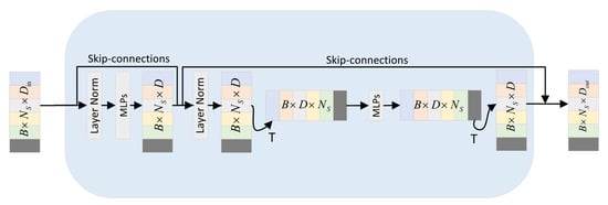 We propose a feature processing network that can interact within and between localities, called a point-mixer. As shown in Figure 4. The point-mixer generates S sequences of non-overlapping point cloud groups as input after passing through a local neighborhood aggregation strategy, and the point cloud group sequences are linearly projected to the desired dimension using the same projection matrix. Where point-mixer consists of multiple layers of the same size, each layer consists of two MLP blocks []. The first layer is the point-mixer intra-group blending MLP: it acts between the interiors of the point-mixer and maps the point-mixer sequences. The second is the inter-group hybrid MLP: it acts between point cloud groups and again maps the mapping back to the same dimensions and representation. Each MLP block contains two fully connected layers and a nonlinear operation is applied to each row of its input data tensor independently. The point-mixer process can be written in the form of Equation (2):