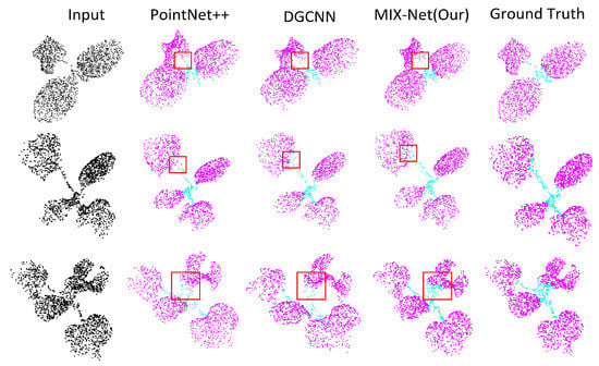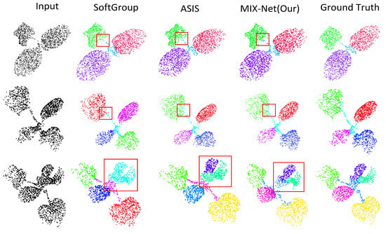 Experiments were conducted using MIX-Net on the seedling point cloud semantic segmentation datasets and compared with PointNet++ and DGCNN networks. The experimental results are shown in Table 2 below, and MIX-Net improved by 3.1% and 1.7%, respectively. The semantic segmentation example of seedlings segmented by MIX-Net is shown in Figure 6. Additionally, the results of the instance segmentation of seedlings compared with Soft-Group and ASIS are shown in Table 3 and Figure 7 below.