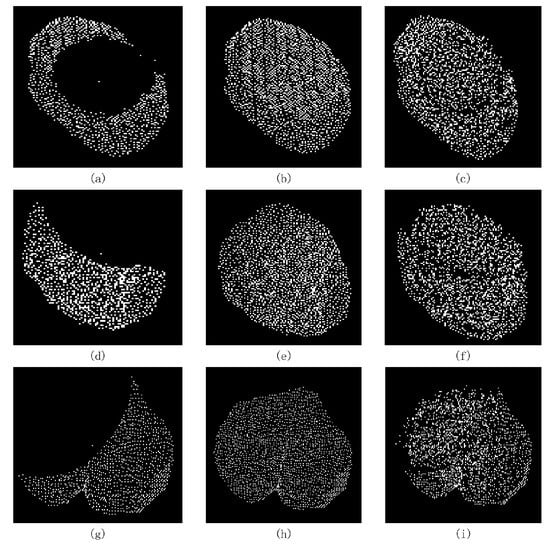 Representation of the complete results of the point cloud leaf datasets on MIX-Net, where (a,d,g) are the missing point cloud leaves from the input network, (b,e,h) are the real complete leaves, and (c,f,i) are the predicted outputs of the MIX-Net network.