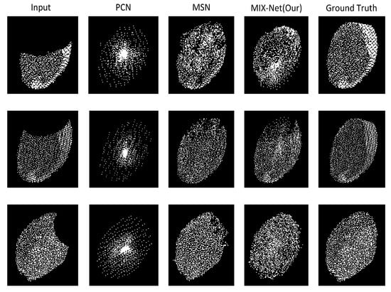 To train our model, we used 13 different objects in the ShapeNet-Part of the benchmark dataset. The total number of shapes is 14,473 (11,705 for training and 2768 for testing). All input point cloud data are centered at the origin, and their coordinates are normalized to [−1, 1]. Ground truth point cloud data were created by sampling 2048 points uniformly on each shape. Incomplete point cloud data were generated by the missing point cloud generation method. We control the parameters to get different numbers of missing points. When comparing our method with other methods, incomplete point clouds with 50% of the original data missing are set up for training and testing. For all network models, the batch size is 16, and each network is trained 100 times separately. The initial learning rate was 0.0001, and a cosine function for learning rate decay was used to adjust the learning rate for each period. Table 8 shows the completion results for each type of network. The evaluation metrics used are CD distance and F-score@1%. The results show that our MIX-Net achieves optimal results in both CD and F-score@1%.