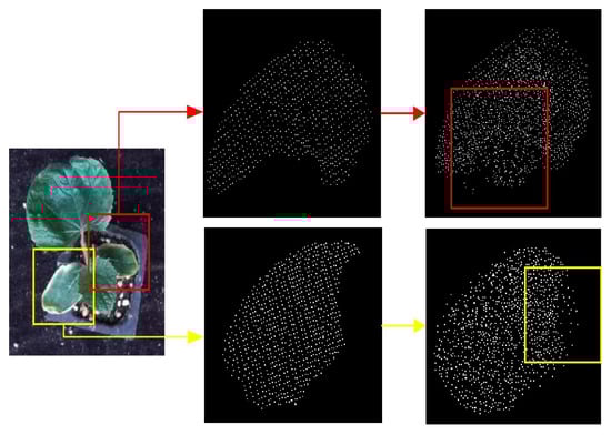 To verify that our experimental results are helpful in realistic phenotypic measurements, we selected 40 seedlings with occlusion, as shown in Figure 10 below, and then used MIX-Net to isolate the missing leaves of the seedlings, and to complete them. Figure 11 gives the correlation coefficient between the true leaf area (by leaf area meter) and the leaf area before repair with = 0.87, = 2.64. The correlation coefficient between the true leaf area (by leaf area meter) and the leaf area after repair after completing is = 0.93, = 2.26. The presence of occlusion is particularly serious, we select the leaves which are severely occluded, and from the result of the patching, we can get complete and uniform leaves, and our method provides help for the nondestructive testing of the whole tray of seedlings.