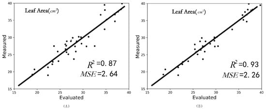 Correlation analysis after leaf area measurement, (A) indicates the correlation analysis between the leaf before restoration and the real leaf; (B) indicates the correlation analysis between the restored and the real leaf.