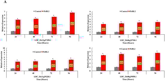 PeBL2 increased the defense response in O. sativa seedlings. All test genes were upregulated by PeBL2 treatment, showing transcripts statistically more expressed than in the control. It was considered that induced resistance was caused by the aphid infestation and enhanced by PeBL2. Although genes involved in the JA pathway were moderately expressed, all JA-associated genes were upregulated after 24, 48, 72, and 96 h of C. exigua infestation (Figure 8A). Similar trends were observed for all SA- and ET-associated genes that were significantly upregulated and significantly different from control samples for all observation times (Figure 8B,C). This suggests that resistance against C. exigua was due to increased transcription of the JA, SA, and ET genes.
