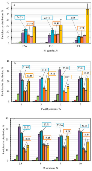 As can be seen in Figure 1, columns of particle size distribution in general are similar when aqueous solutions of different binders are used. In all cases, the fractions of three different sizes (1.0–2.0, 2–3.15, and >5.0 mm) predominate. However, from the standard deviation presented in Figure 1, it can be seen that the data vary in different intervals and their statistical reliability depends on both the binder and the size of the fraction. For example, when using water or carboxymethyl cellulose (Figure 1a,e), the data dispersion is significantly higher than when using other binders. The number of granules of the larger fraction (>5 mm) varies in a particularly wide range when produced with all binders except starch. The amount of the marketable fraction varies more significantly only when using water and cellulose (Figure 1a,e), so in other cases, the results are sufficiently statistically reliable. Using water and starch solution (Figure 1a,d) resulted in a slightly larger amount (%) of larger granules, while the use of other binders (Figure 1b,c,e) produced a larger amount (%) of smaller granules. When analyzing the particle size distribution, it should be noted that in all cases, a relatively small amount (%) of granules (diameter 2.0–4.0 mm) attributable to the marketable fraction was formed.