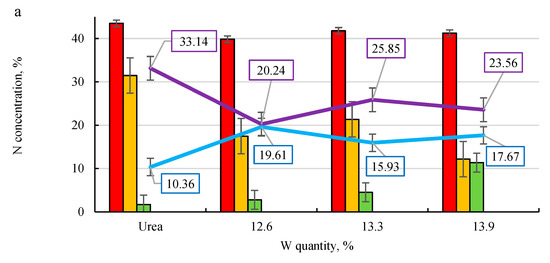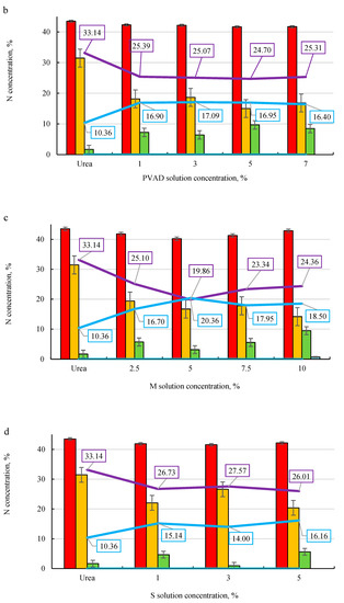 As the data in Figure 5a shows, the total concentration of nitrogen in the solution after filtration through sand can be reduced from 33.14% from pure urea to 20–26% from microalgae-enriched urea. This means that loose nitrogen was reduced by 22–40%. It should be noted that most of the nitrogen was leached out the 1st time, but the use of microalgae lowers the extent of leaching compared to that of pure urea. When analysing the influence of different binders on nitrogen leaching, it can be seen that the addition of PVAD (Figure 5b) slowed the urea solubility the most, because in the 2nd stage of leaching a sufficiently high concentration of nitrogen was found in the filtrate. The addition of molasses also had a fairly good effect, as using a 10% M solution as a binder (Figure 5c) resulted in nitrogen being detected in the filtrate of the 3rd leaching stage. The addition of starch and cellulose was less effective in slowing down the dissolution of urea.