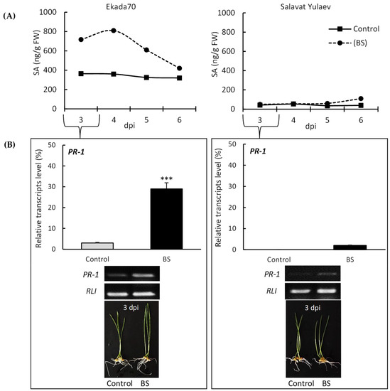 Influence of B. subtilis 10-4 (BS) on endogenous salicylic acid (SA) accumulation (A), and the relative level of PR-1 gene transcripts versus the reference gene RLI (RNase L inhibitor-like protein) (B) in seedlings of wheat contrasting in drought susceptibility (cv. Ekada70, drought-tolerant (DT); cv. Salavat Yulaev, drought-susceptible (DS)). FW—fresh weight; dpi—days post-bacterial inoculation. The average data of three independent replicates and their SEM were presented. ***—indicates a significant difference between uninoculated control and inoculated seedlings (p ˂ 0.05).