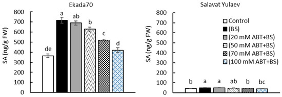The results showed that, depending on the increase in ABT concentration, the content of B. subtilis-induced endogenous SA decreased in 3 dpi seedlings of DT cv. Ekada70 and reached almost the control seedlings levels upon 100 mM of ABT (Figure 2). This finding suggests that B. subtilis 10-4 might be involved in controlling de novo SA synthesis in these seedlings. As for DS cv. Salavat Yulaev, at the same stage of ontogenesis (3 dpi), there were no significant changes in endogenous SA upon the co-application of strain 10-4 and ABT in comparison with DT cv. Ekada70.