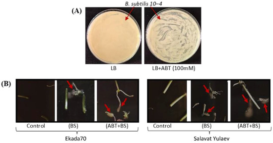 Influence of the SA biosynthesis inhibitor 1-minobenzotriazole (ABT) (100 mM) on the growth of B. subtilis 10-4 bacteria cells in Petri dishes with LB nutrient medium (A) and the capacity of B. subtilis 10-4 (BS) colonizing surface-sterilized wheat seedlings’ inner tissues (3 dpi) (B). Red arrows indicate the growth of B. subtilis 10-4 bacteria around the segments of surface-sterilized seedlings of wheat.