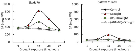 It was discovered that incubation in 12% PEG-6000 (drought stress) caused a reversible rise in endogenous SA levels in wheat seedlings, reaching maximum amounts after 24 h of stress exposure (Figure 4) of up to two times for cv. Ekada70 and four times for DS cv. Salavat Yulaev (indicating that DS seedlings react more strongly to stress), followed by a gradual decrease to control values by 72 h of stress exposure (6-day-old seedlings). B. subtilis pretreated seedlings in DT cv. Ekada70 had a visibly lower level of PEG-caused SA accumulation (Figure 4A). So, under stress conditions in cv. Ekada70, the application of B. subtilis 10-4 helped maintain the SA level by 125% relative to the control value (Figure 4A). Inoculation with B. subtilis 10-4 neutralized stress-caused endogenous SA accumulation in seedlings of cv. Salavat Yulaev (Figure 4B). This is consistent with our finding of delayed SA accumulation in this cultivar (Figure 1A). However, the application of ABT completely prevented B. subtilis-caused endogenous SA changes in the seedlings of both cultivars under drought. The endogenous SA content in stressed seedlings treated with B. subtilis 10-4 and ABT was comparable to that of control ones (Figure 4).