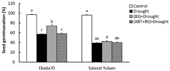 Drought significantly decreased the germination rate for DT cv. Ekada70 (by 1.7 times) and DS cv. Salavat Yulaev (by 2.5 times) (Figure 5). For DT cv. Ekada70, the application of B. subtilis 10-4 increased seed germination during drought by up to 1.3 times compared to an uninoculated control. Particularly, under drought, the germination was increased from 57% in non-bacterized seeds to 74% in bacterized seeds. However, the protective effect of B. subtilis 10-4 on the seed germination percentage upon drought was prevented by the simultaneous use of B. subtilis 10-4 and the endogenous SA biosynthesis inhibitor ABT and was 58%. As for DS cv. Salavat Yulaev, there was no apparent protective effect of B. subtilis 10-4 on seed germination under drought. Particularly, under drought, the germination in uninoculated and inoculated seeds was 39% and 42%, respectively, while in groups with the co-application of B. subtilis 10-4 and ABT, the seed germination was 40% (Figure 5).