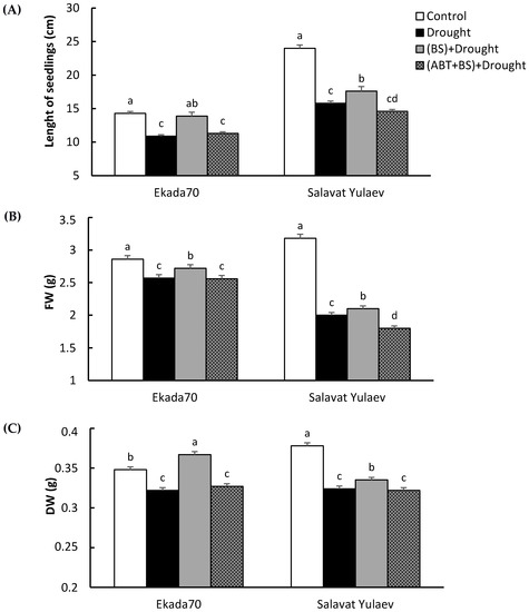 Exposure to drought for 72 h resulted in a reduction in the wheat seedling length, as well as a decreased DW and FW (Figure 6). Drought has reduced the seedlings’ length by 1.3 (cv. Ekada70)–1.5 (cv. Salavat Yulaev) times (Figure 6A); FW by 1.1 (cv. Ekada70)–1.8 (cv. Salavat Yulaev) times (Figure 6B); and DW by 0.95 (cv. Ekada70)–1.45 (cv. Salavat Yulaev) times (Figure 6C). Pretreatment with B. subtilis 10-4 reduced the adverse effects of drought on the early wheat seedlings’ growth of both DS and DT cultivars (Figure 6). However, this protective effect was eliminated when in groups with a joint application of B. subtilis 10-4 and ABT; the length of seedlings was similar to that of the control. Similar results were obtained when assessing the influence of ABT on the FW and DW of bacterial-inoculated and drought-stressed wheat seedlings (Figure 6B,C).
