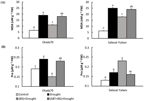 An exposure of 3-day-old seedlings to 12% PEG for 24 h led to a significant increase in proline and lipid peroxidation (i.e., malondialdehyde (MDA)) levels (Figure 8). B. subtilis (strain 10-4)-treated seedlings subjected to drought showed decreased levels of stress-induced MDA accumulation compared with the MDA levels found in non-bacterized stressed seedlings (Figure 8A). It was found that, under drought in DS and DT genotypes, upon bacterial treatment, the content of proline was changed in different manners (Figure 8B). In particular, in the bacterial-inoculated plants of DT cv. Ekada70, stress-induced proline accumulation was effectively decreased and was even lower than that in the control, while in DS cv. Salavat Yulaev, an additional proline accumulation was observed (Figure 8B). ABT completely prevented such B. subtilis 10-4-mediated changes in proline or MDA under drought for both genotypes. In summary, the seedlings co-treated with B. subtilis 10-4 and ABT under drought conditions did not differ in the content of MDA and proline from untreated control plants subjected to drought (Figure 8).