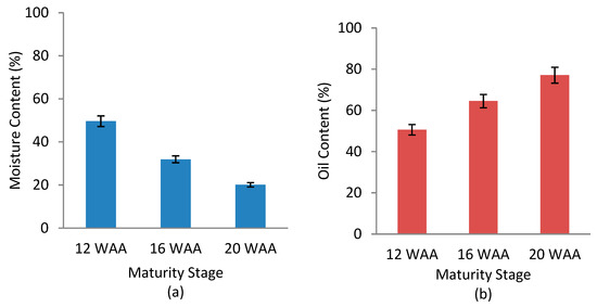 The MC and OC results across the three maturity stages (12 WAA, 16 WAA, and 20 WAA) are shown in Figure 1. With fruit development from 12 WAA to 20 WAA, the mesocarp MC decreased linearly from around 46% to 19% (Figure 1a), while the mesocarp OC increased linearly from around 54% to 78% (Figure 1b). The changes in the mesocarp MC and OC were due to the deposition of oil in the endosperm, which began at 12 WAA and was almost complete at 16 WAA [34]. Oil deposition then continued in the mesocarp until fruit maturity at 20 WAA [35,36]. The OC increased rapidly after 12 WAA, reaching the maximum of around 78% in the fresh mesocarp at 20 WAA, which was found to be the optimal time for harvesting. The MC in the fruitlet mesocarp showed a decreasing trend during the ripening process due to the rapid accumulation of oil in the mesocarp, which is consistent with the recent findings of Suresh and Sanjib [37]. Statistical analysis of variance (ANOVA) showed significant differences between the three maturity stages for both MC and OC at p < 0.05 (Table 1 and Table 2).