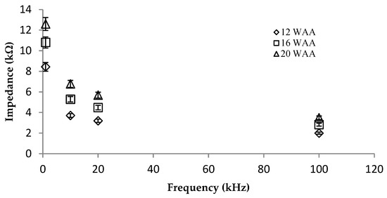 The impedance measurements at the four discrete frequencies of 1 kHz, 10 kHz, 20 kHz, and 100 kHz were determined for the three maturity stages of the oil palm fruitlets (12 WAA, 16 WAA, and 20 WAA) (Figure 3). All the maturity stages showed a similar electrical resistivity trend, whereby the impedance was lower at higher measurement frequencies. As shown in Figure 3, the 20 WAA maturity stage had the highest impedance, followed by those of 16 WAA and 12 WAA. These results indicate that oil palm fruitlets at later WAA stages had higher OC, lower MC, and higher impedance than oil palm fruitlets at earlier WAA stages. This was because oil palm fruitlets with high OC conduct electricity poorly as they have more resistance, thus resulting in higher impedance values. This finding agrees with the results obtained from bananas [25], mangoes [41], and apples [42], which showed declining impedance trends across the frequencies as the fruits ripened. A similar phenomenon has been observed in the electrical impedance of apple fruit tissue, which is thought to correspond to the dispersion caused by the capacitance of cell membranes [43]. Since the dielectric properties (in this case, electrical impedance) of biological tissues are considered primarily dependent on the ionic conductivity of fluids in the cellular structure and the water activity of the organisms, ionic conductivity is the factor that influences this behavior [44]. This phenomenon became the basis on which to produce statistical models from the electrical impedance measurements to predict and/or discriminate between the quality of the oil palm fruitlets.