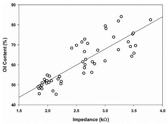 Figure 2 shows the inverse linear regression line between the MC and OC during fruit development, with an R2 of 0.86. This trend is similar to that described by Ariffin et al. [38] and Hartley [39] in their studies, which explain that when oil palm fruitlets ripen, the OC inside the fruitlets reach their maximum value, while the MC reaches its minimum value. The inverse linear relationship between the MC and OC in oil palm fruitlets was also reported in the literature and can be used as a parameter to determine the mesocarp ripeness. When changes occur in the amount of moisture in the fruitlets, a change in the electrical impedance can be measured due to the sensitive and evident response of the water molecules when exposed to an alternating electrical current [40].
