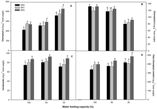Chlorophyll a content increased with drought stress application. The treatment of plants with BX2 significantly (p ≤ 0.05) increased chlorophyll a under 50% (from 255 to 291) and 30% (from 358 to 426) WHC (Figure 1A). Chlorophyll b content declined with water deficiency treatments. Although the BX1 treatment reduced the chlorophyll b content under 100% WHC, it led to significant increases under 30% WHC (356 to 377). The BX2 treatment induced the highest chlorophyll b content under both water deficiency treatments (Figure 1B). The carotenoid content was slightly reduced under 30% WHC. The BX2 led to a significant (p ≤ 0.05) increase in carotenoid content at 50% and 30% WHC (13% and 19%) (Figure 1C). The total chlorophyll content increased with the increase in water deficiency. The BX2 treatment induced significant increases (p ≤ 0.05) in the total chlorophyll content for the 50% WHC (14% increase) and 30% WHC (14% increase) treatments (Figure 1D).